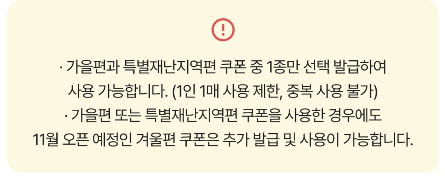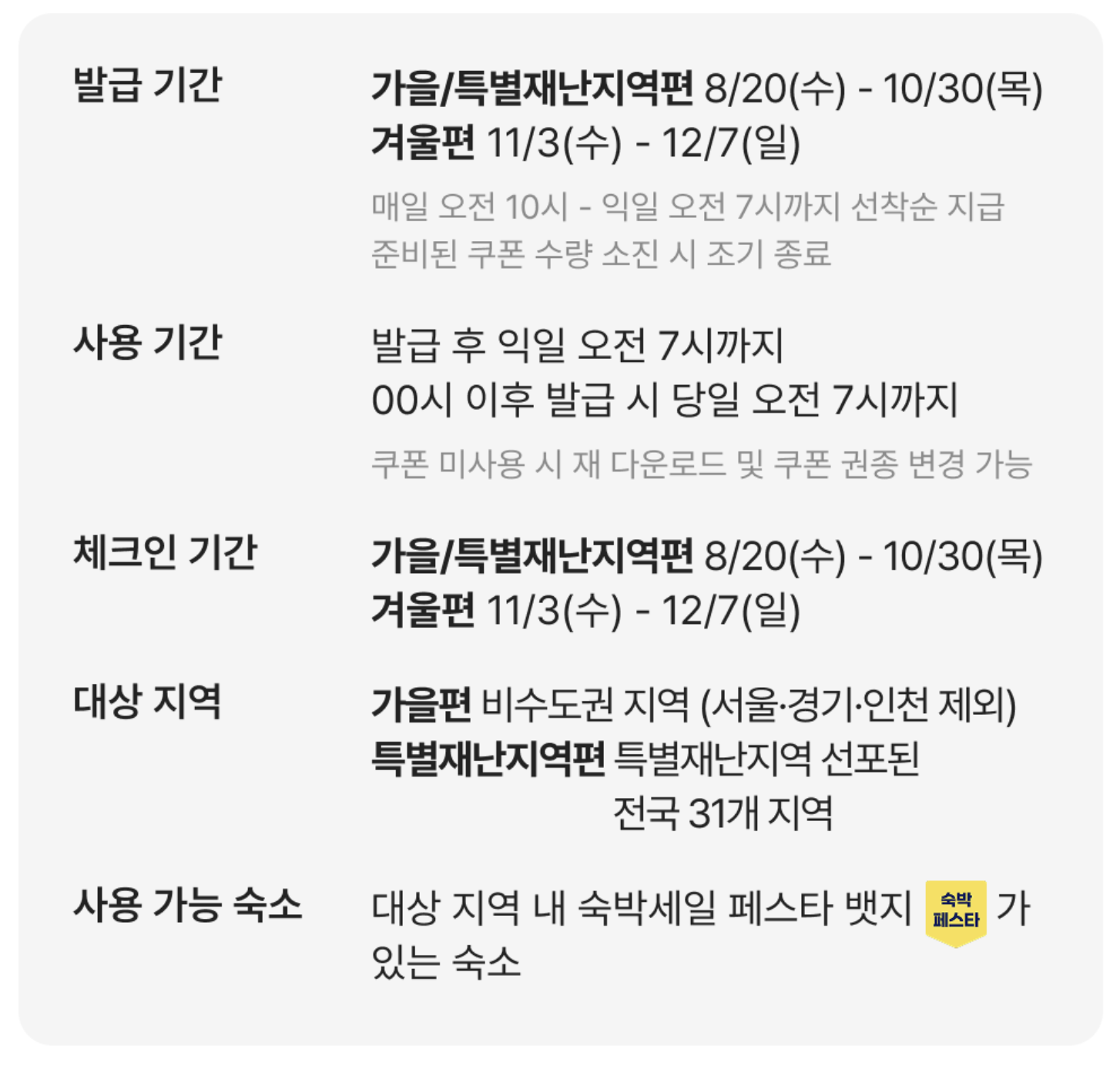 ✔️ 숙박세일페스타 쿠폰은 1인 1매만 발급 가능하며, 가을편과 재난지역편 중 1가지만 선택 사용 가능합니다.