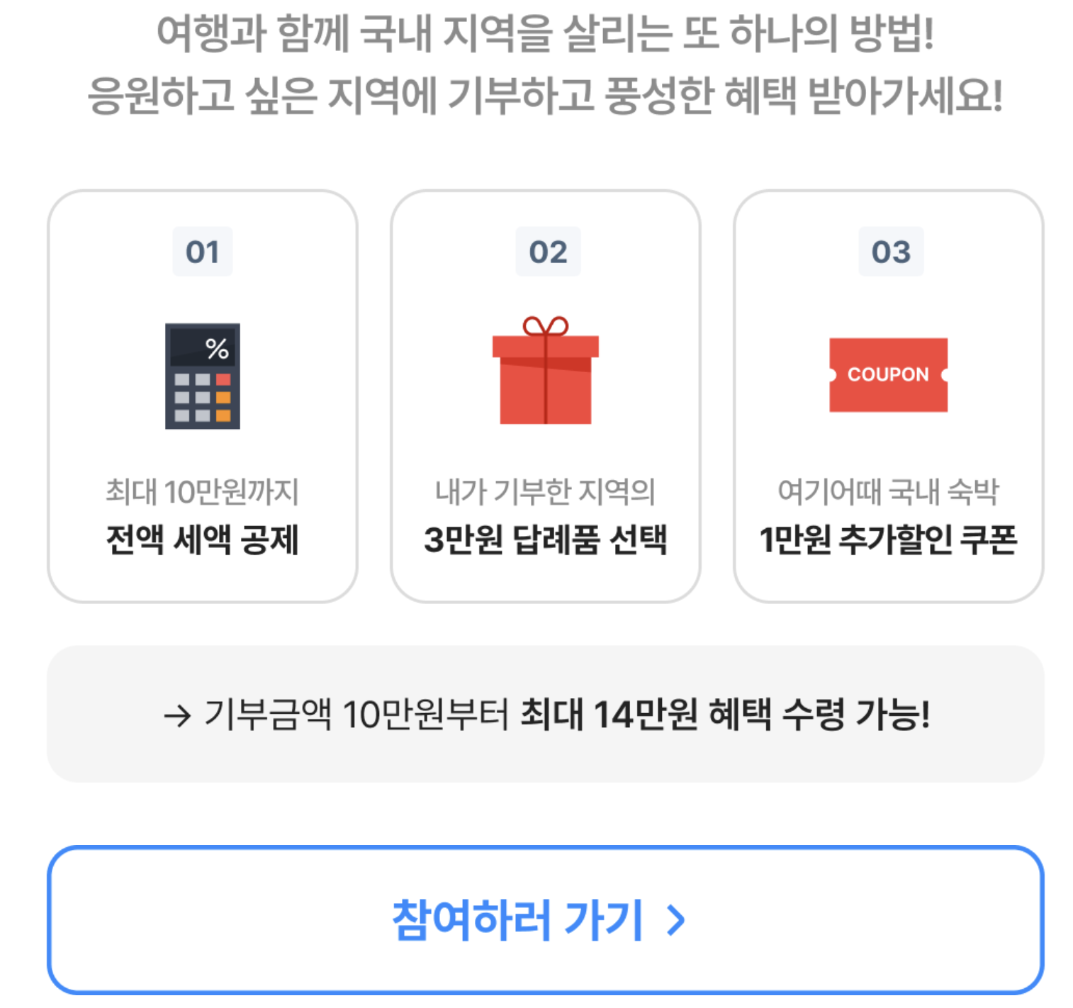 여기어때는 고향사랑기부제 참여자를 위한 추가 1만원 쿠폰도 제공합니다. 세액공제와 함께 숙박 할인도 받을 수 있는 일석이조 혜택!