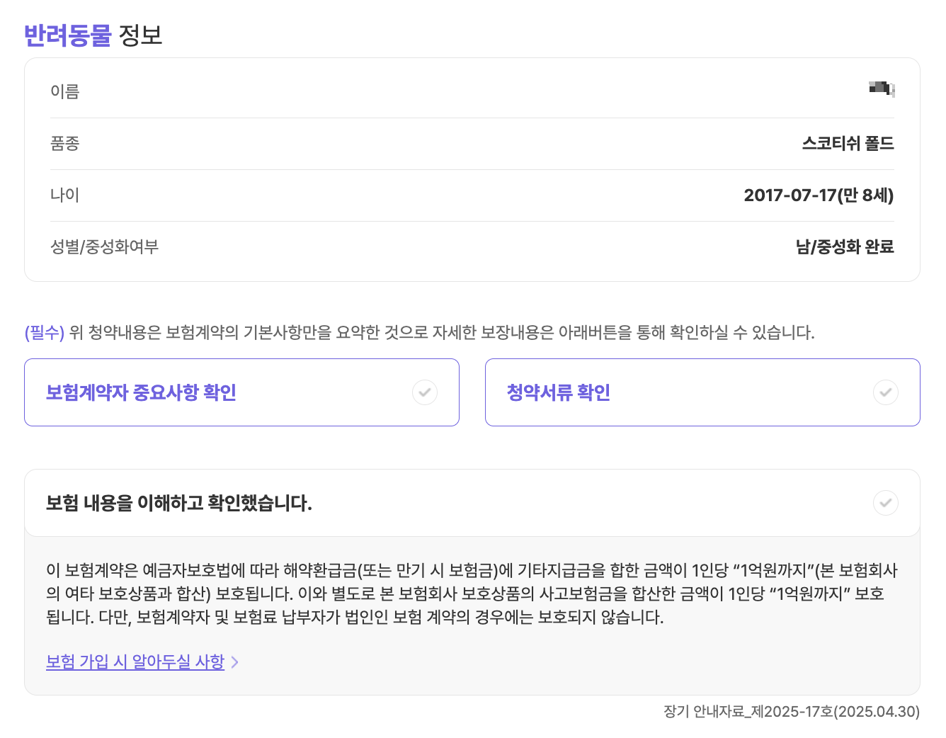 맘보는 이미 발병이 된 후라서 따따의 보험료를 알아보기로 했어요 우리 따따는 8살이고 스코티쉬 폴드(스트레이트)에요. 기본형 기준으로 월 40,000원이상 나왔어요. 비싸다고 느낄 수 있지만, 하루 기준으로 보면 약 1000원 정도죠. 병원 한 번만 가도 몇 만원이니, 예방차원에서 충분히 가치 있다고 생각합니다.