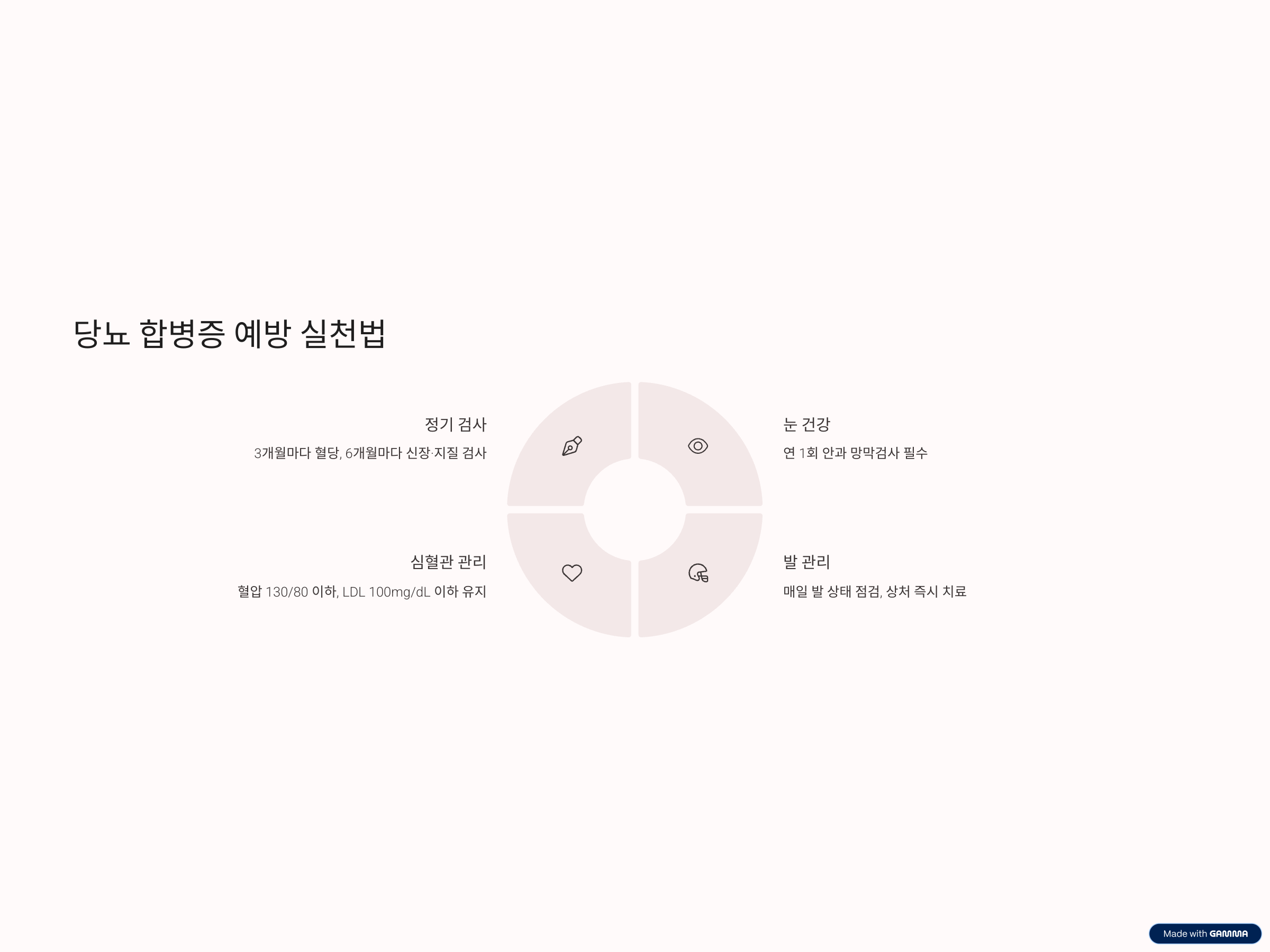 조기에 검진하고, 눈과 발을 자주 점검하며, 혈압과 식단까지 꼼꼼하게 관리한다면