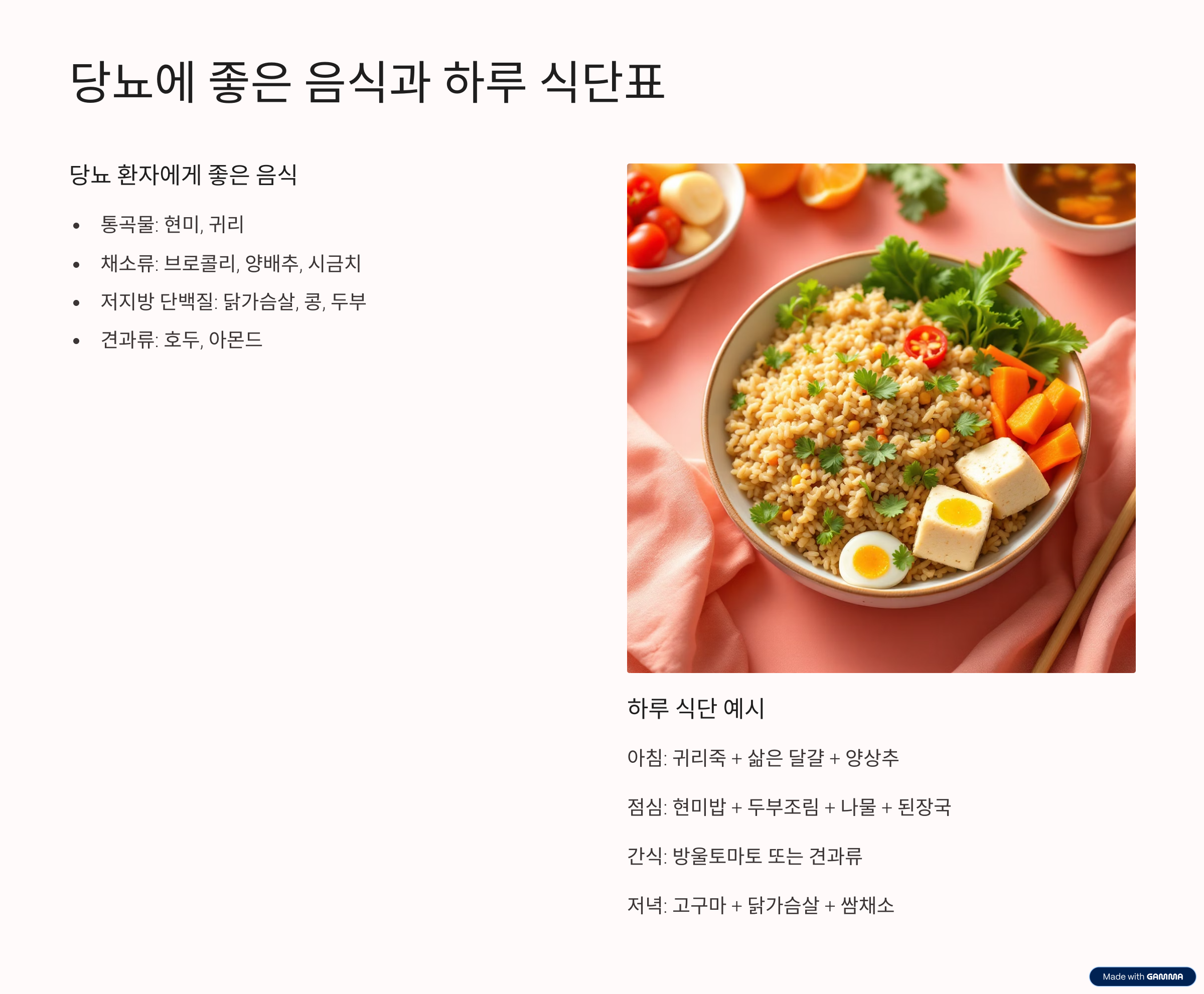 - 통곡물(현미, 귀리): 혈당을 천천히 올려줌