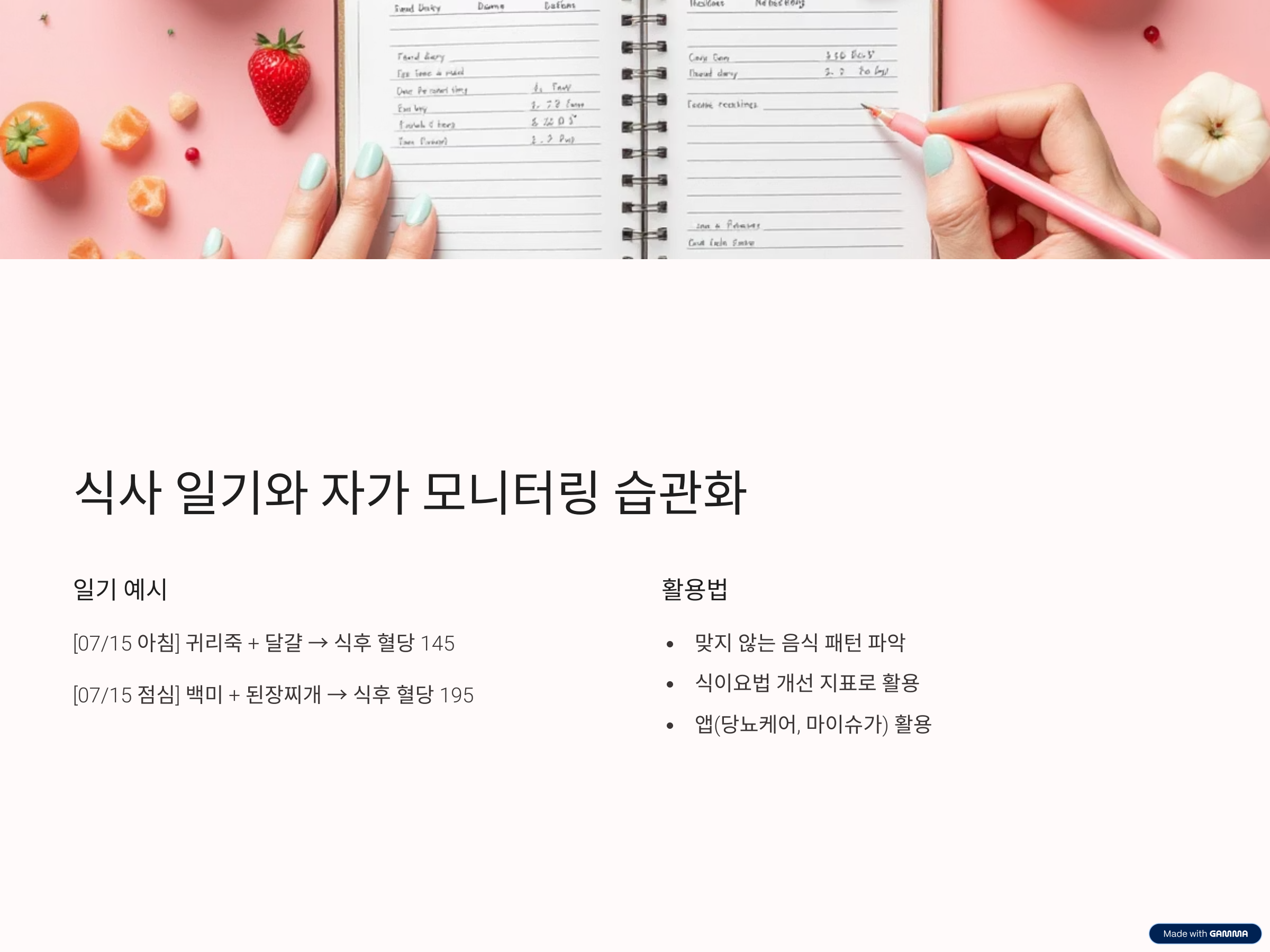 - 도구: 앱(당뇨케어, 마이슈가), 노트 등 자유롭게 선택